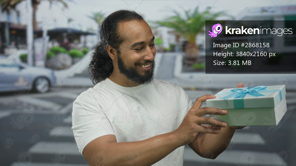 Man holding teal gift box and smiling while standing at a busy city street crosswalk with palm trees in view; joy generosity.