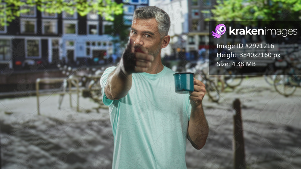 Man holding teal mug in hand on a street near bicycles and a canal, points finger toward camera; casual confidence.