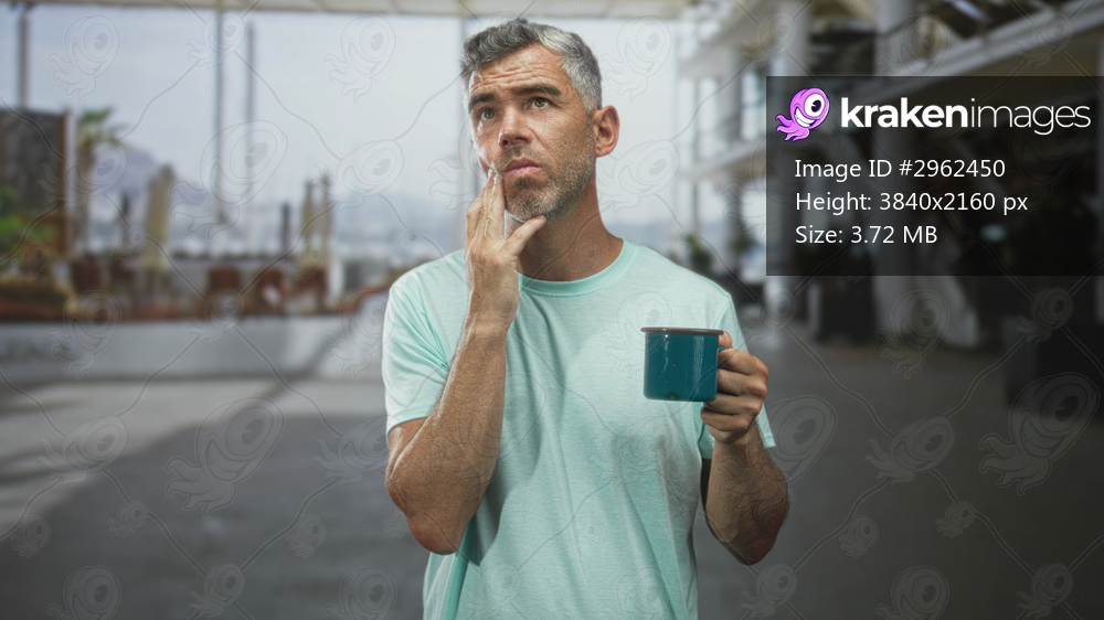 Man holding teal mug presses cheek with wince and closed eyes for toothache inside a bright building concourse; discomfort morning routine.