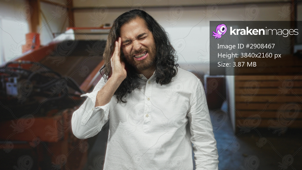Man holding temple with hand and closing eyes in warehouse building amid machinery and wooden pallets; stress fatigue.