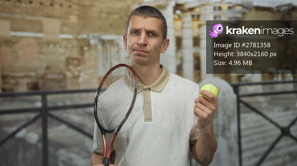 Man holding tennis racket and ball stands in front of ancient roman ruins, expressing uncertainty or thoughtfulness in an outdoor setting.