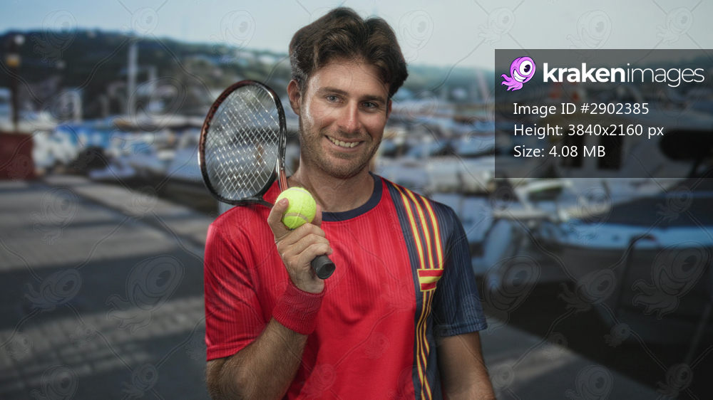 Man holding tennis racket and ball while smiling on street with boats and marina in view; confidence leisure.