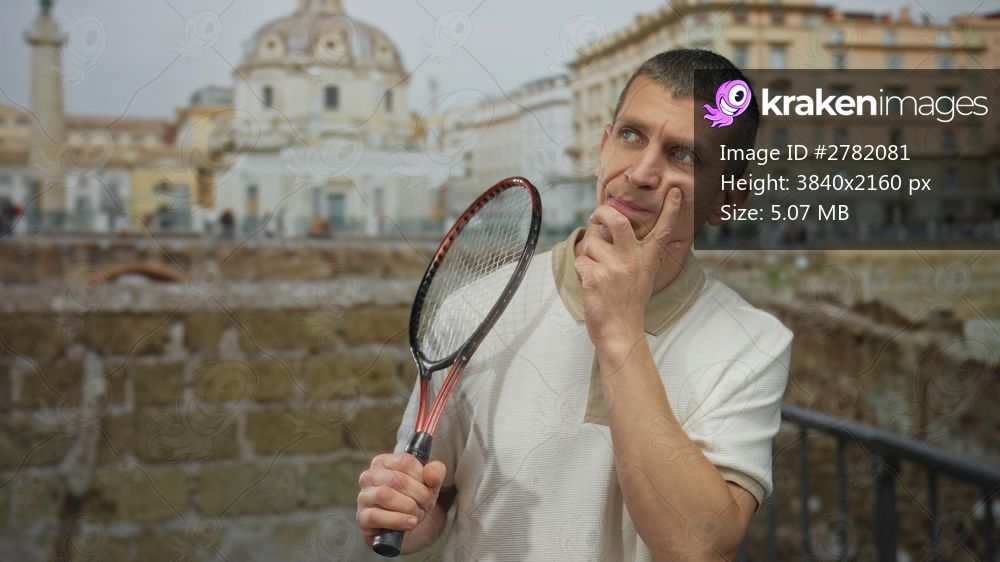 Man holding tennis racket thoughtfully stands near roman ruins showing contrast between sports and history outdoors.