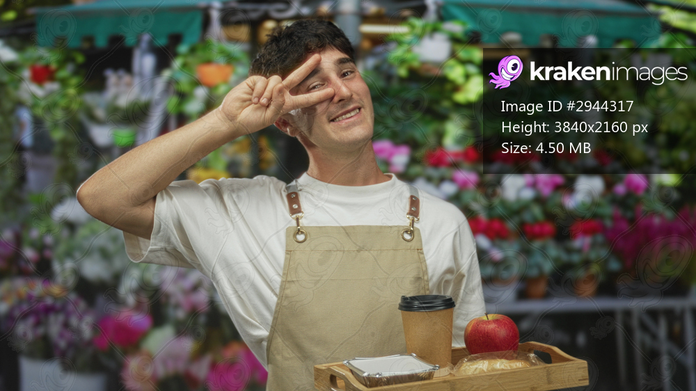 Man holding tray with coffee and apple and flashing peace sign hand in street flower shop; cheerful service.