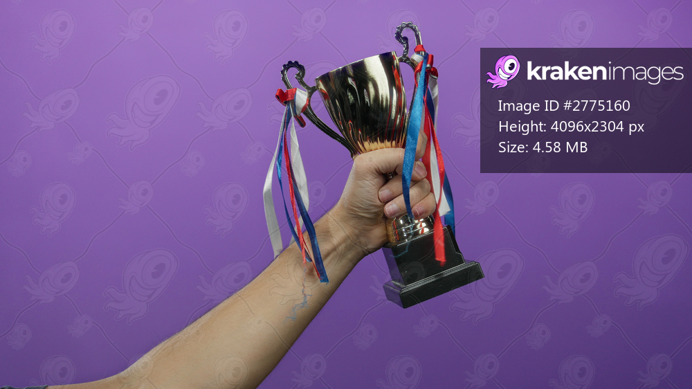 Man holding trophy with colorful ribbons against a vibrant purple background symbolizes achievement and success.