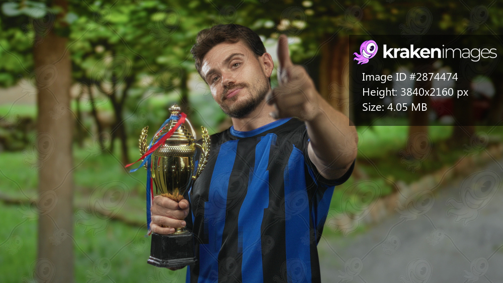 Man holding trophy points finger in forest wearing blue striped jersey in green park setting; pride victory.