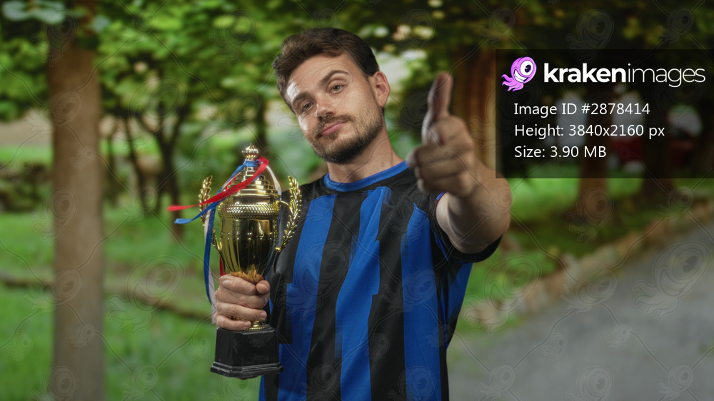 Man holding trophy points finger in forest wearing blue striped jersey in green park setting; pride victory.