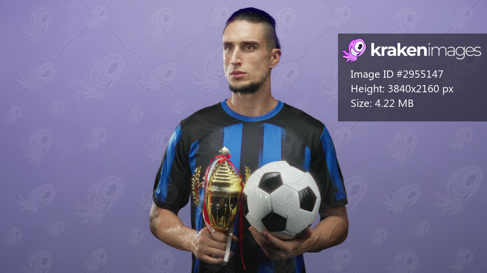 Man holding trophy and soccer ball in studio, wearing blue and black striped jersey and looking sideways; pride achievement teamwork.