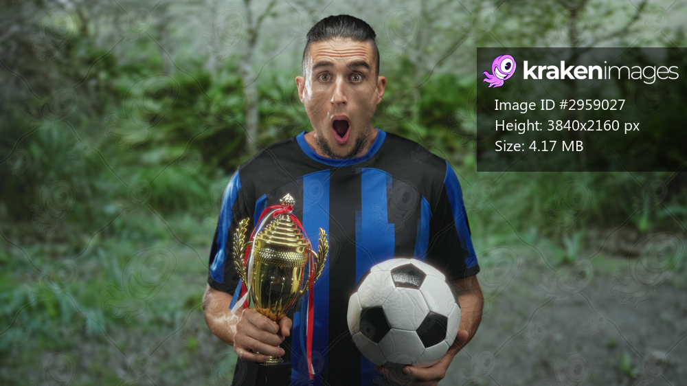 Man holding trophy and soccer ball with mouth open in forest after a win, hands gripping cup and ball; pride celebration.