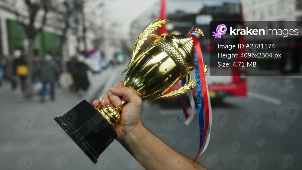 Man holding trophy triumphantly on city street with blurred background, capturing outdoor victory celebration theme.