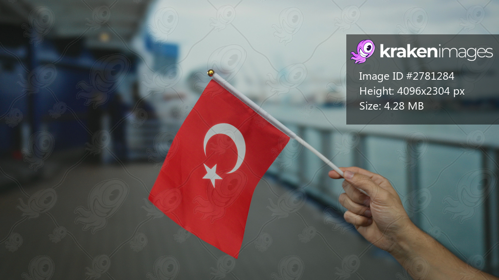 Man holding turkish flag on boat with seaside view, evoking travel and cultural pride, showcasing the vibrant red flag against a blurred maritime background. - Kraken Images