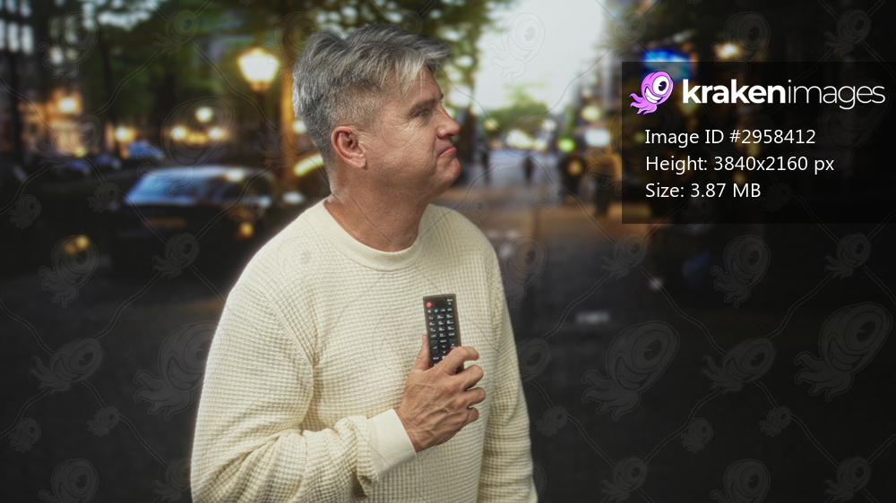 Man holding tv remote against chest in a dim city street at dusk wearing cream sweater and neutral expression; quiet bemusement.
