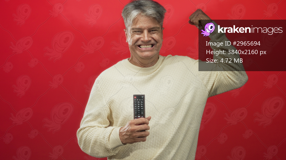 Man holding tv remote and flexing arm like a singer in studio with red backdrop and cream sweater; joy celebration.