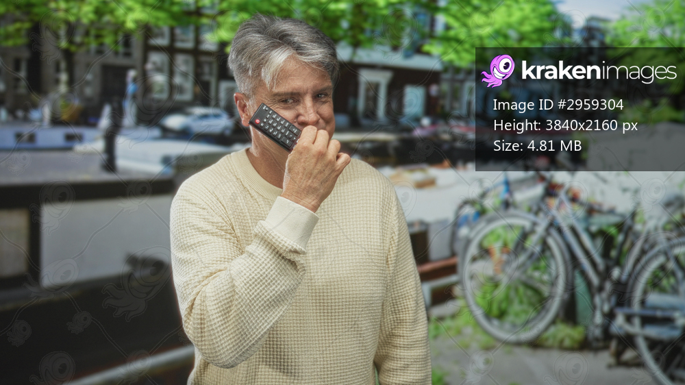 Man holding tv remote to cheek on a street canal with parked bicycles and buildings; contentment leisure.
