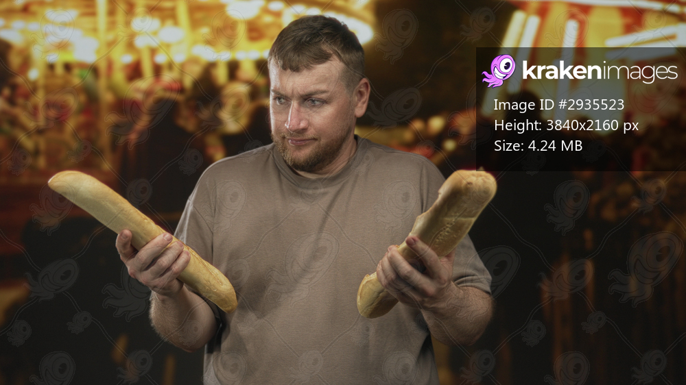 Man holding two baguettes with both hands at a street fair at night, inspecting breads; uncertainty.