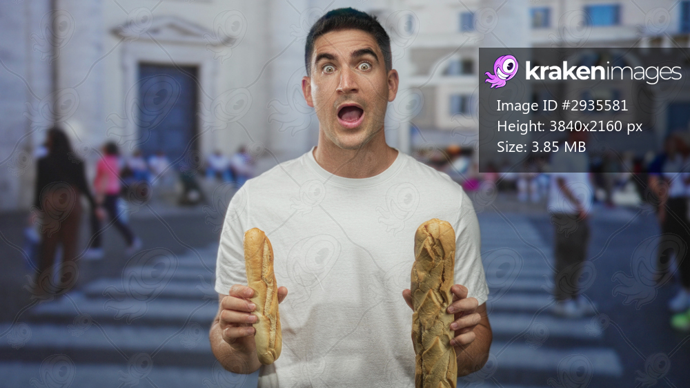 Man holding two baguettes in hands on a busy street with open mouth expression; food humor surprise.
