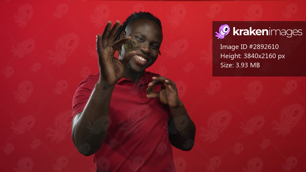 Man holding two bitcoin coins up to his eyes and smiling in red studio; cryptocurrency wealth investment joy.
