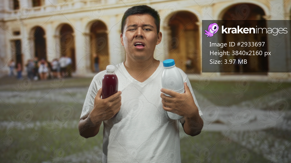 Man holding two bottles with bare hands, clutching a white jug and a red drink while grimacing in a building courtyard in old town outdoors; disgust.