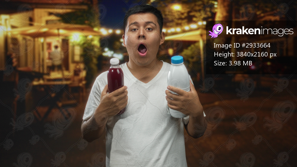 Man holding two bottles with hands and mouth open on a street terrace at night, wearing a white t shirt and looking surprised; surprise decision.