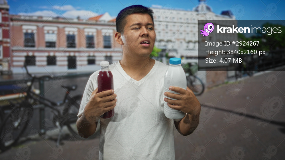 Man holding two bottles on an urban street, grimacing while comparing contents; disgust hesitation choice.