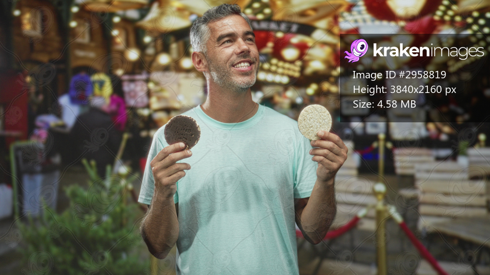 Man holding two corn pastries in both hands with a cheerful smile amid festive market lights street; joyful choice.