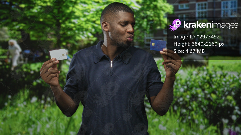 Man holding two creditcard with visible chip in hands, comparing a white card and a blue card while standing before a building with trees and grass; choice contemplation. - Kraken Images