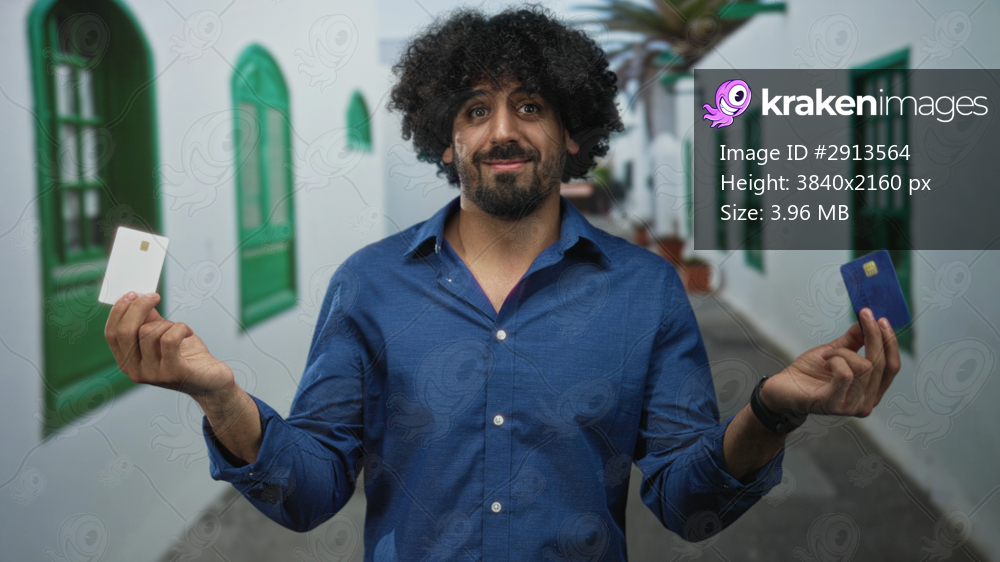 Man holding two creditcards in hands in a street with green windows and potted plants; financial choice uncertain.