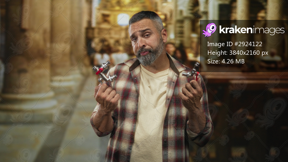 Man holding two faucet valves with visible hands in church building, wearing plaid shirt and examining valves; faith repair contemplation.