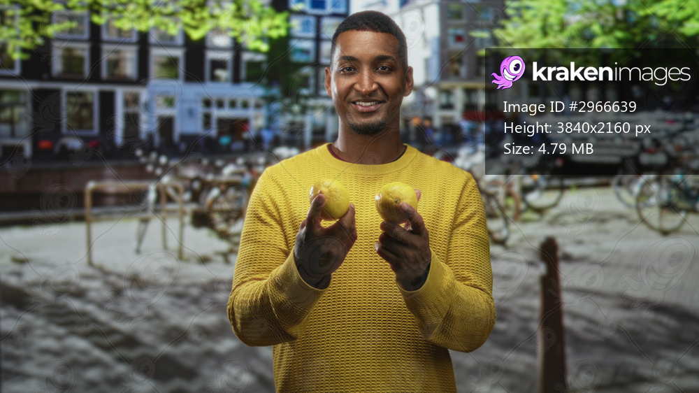 Man holding two lemons with hands visible, smiling in yellow sweater on street canal; playful happiness.