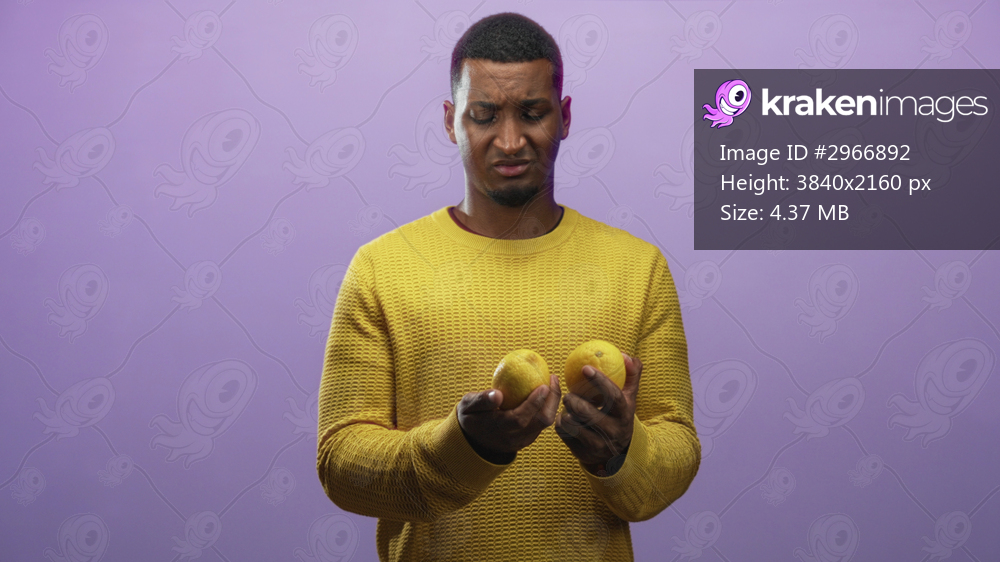 Man holding two lemons in hands with a disgusted grimace, wearing yellow knit sweater, framed against purple backdrop in studio; disgust hesitation.