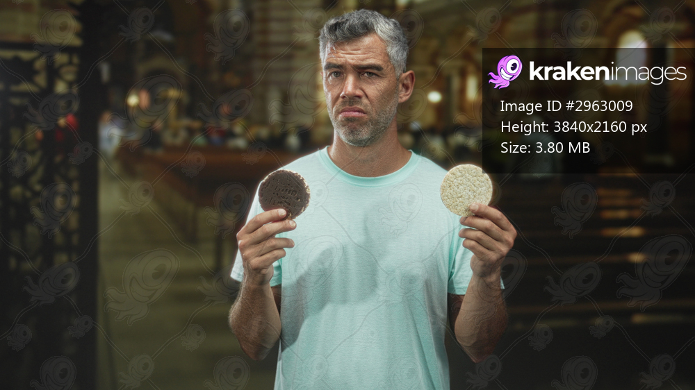 Man holding two round corn pastries, eyes closed and frowning while comparing snacks inside building with pews and altar visible; indecision.
