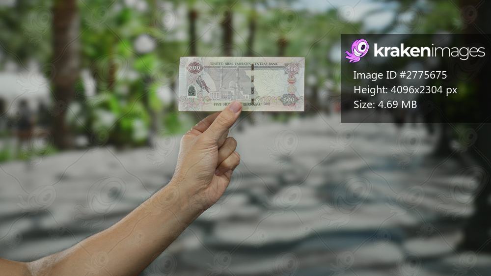 Man holding uae dirham banknote outdoors on city street with blurred background, showcasing currency and economic concepts.