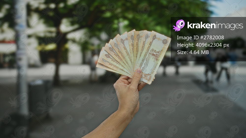 Man holding uae dirham banknotes on a city street, showcasing finance and currency in an outdoor urban environment.