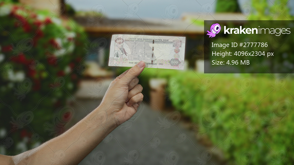 Man holding united arab emirates dirham banknote in outdoor park setting on a sunny day showcasing wealth and finance.