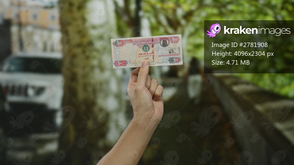Man holding united arab emirates dirham banknote on city street outdoors with trees and cars in background showing caucasian hand in focus.