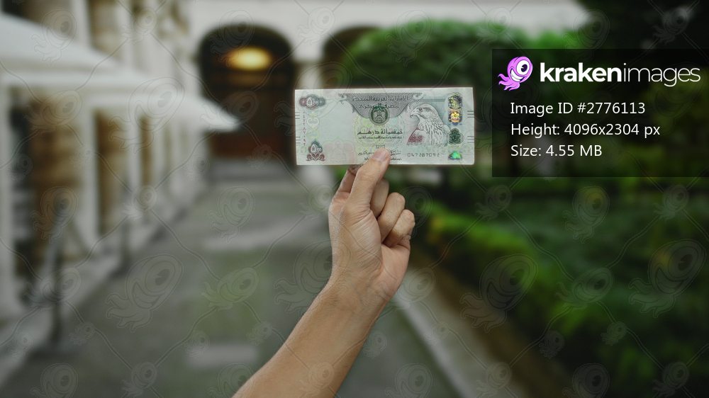 Man holding united arab emirates dirham banknote outdoors in city street, showcasing currency in hand against urban backdrop with blurred buildings and greenery. - Kraken Images