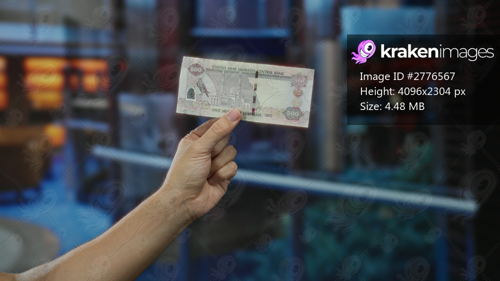 Man holding united arab emirates dirham indoors with blurred hotel background and blue tones.