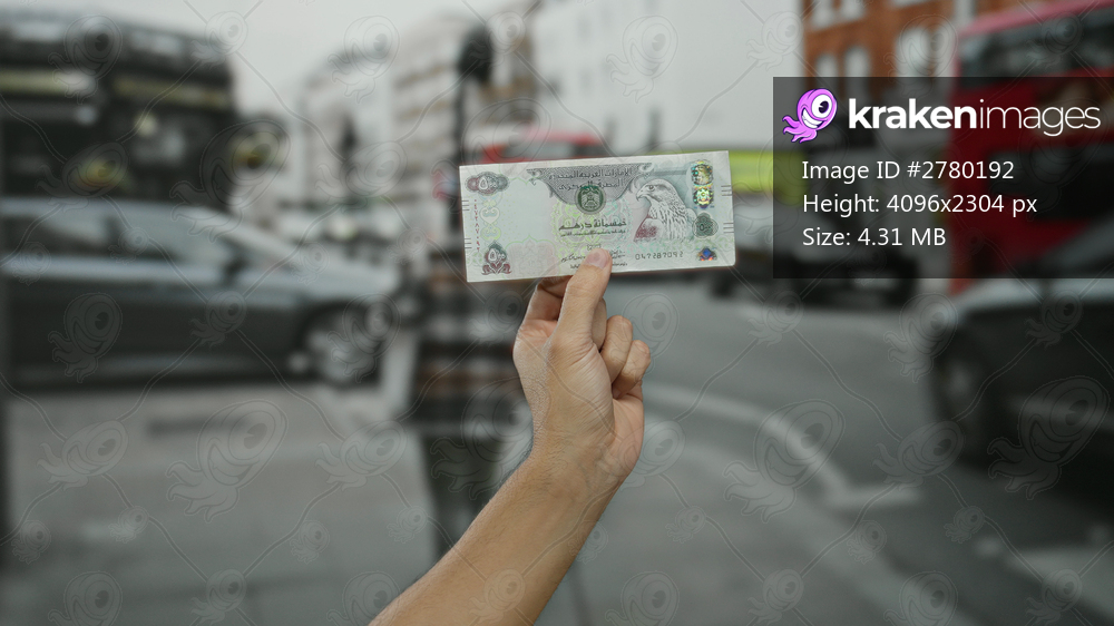 Man holding united arab emirates dirham outdoors on city street with buses and cars in background illustrating urban environment and multicultural identity - Kraken Images