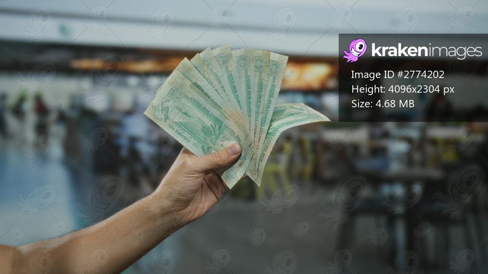 Man holding united arab emirates dirhams in a coffee shop with a blurred restaurant background.