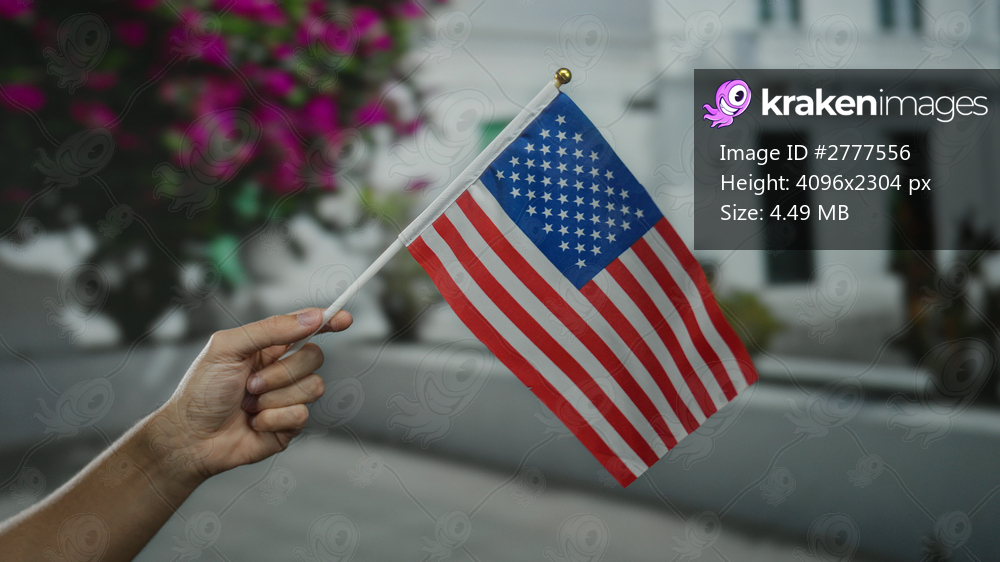 Man holding united states flag in city street, symbolizing american patriotism with a hand gesture against urban background.