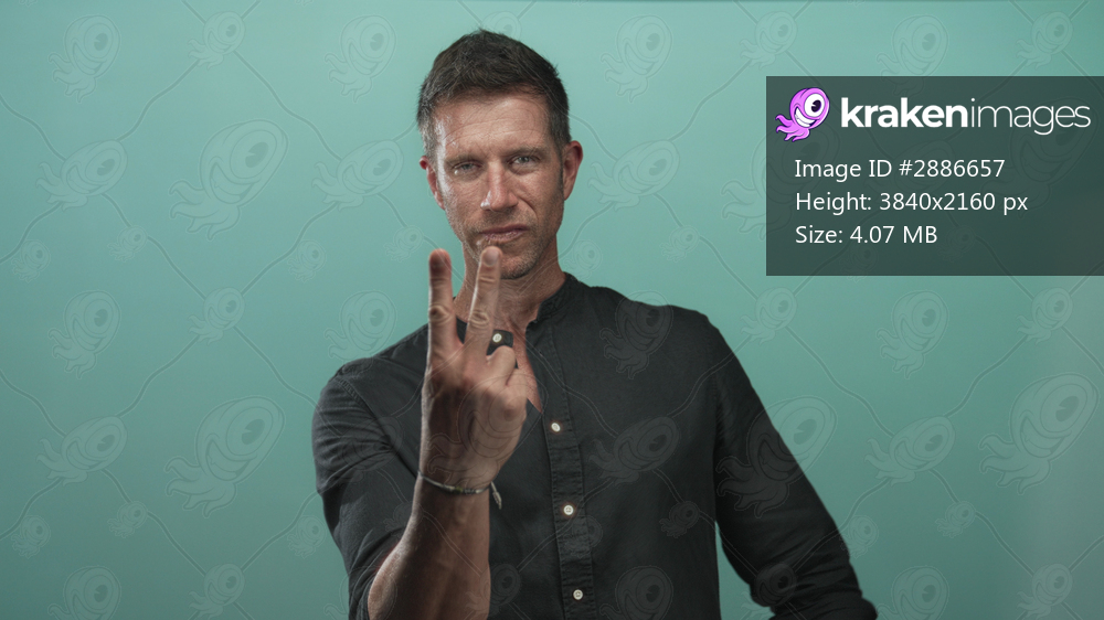 Man holding up two fingers with hands forward wearing casual black shirt and visible bracelet in studio with teal wall; playful.