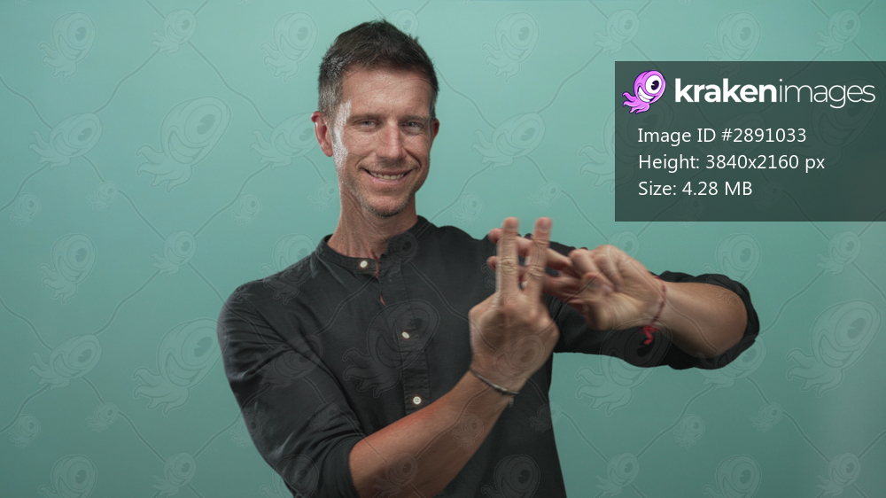 Man holding up two fingers with hands forward wearing casual black shirt and visible bracelet in studio with teal wall; playful.