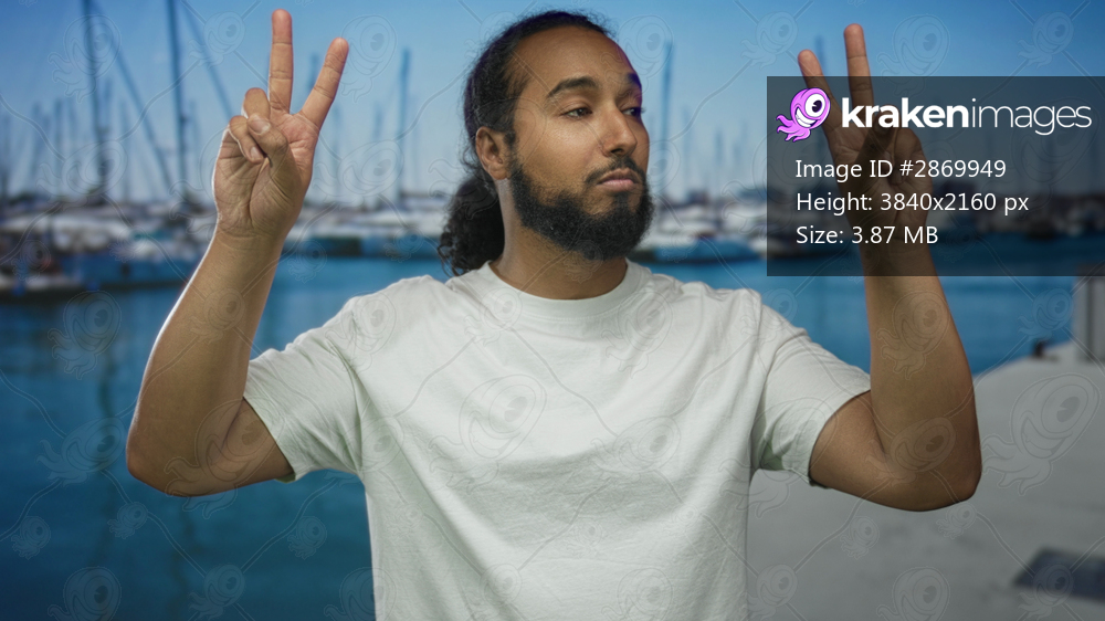 Man holding up two fingers in peace sign with both hands on a street side marina pier with visible boats and water; playful ease.