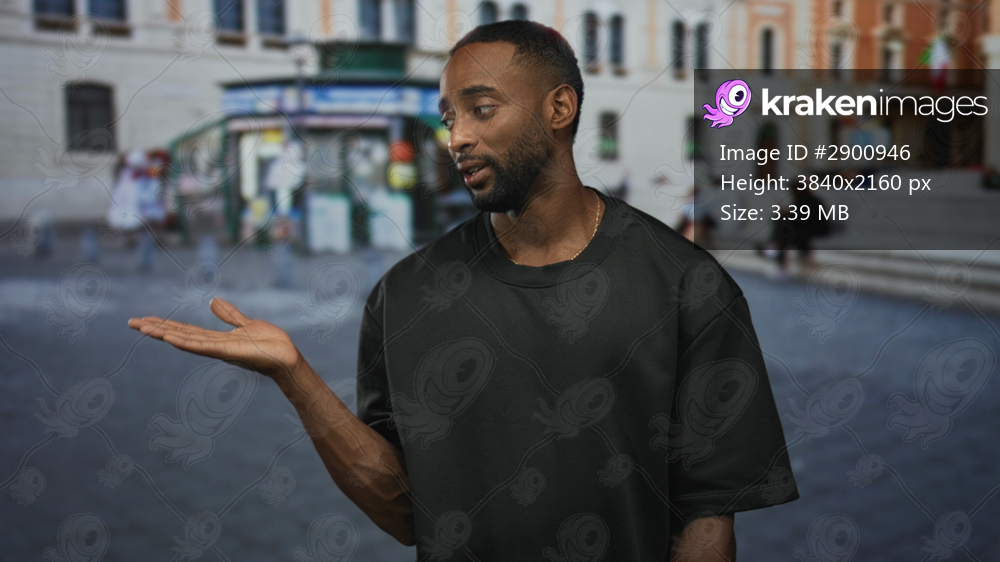 Man holding up two fingers with open palm gesture on city street, speaking and gesturing; calm confidence.
