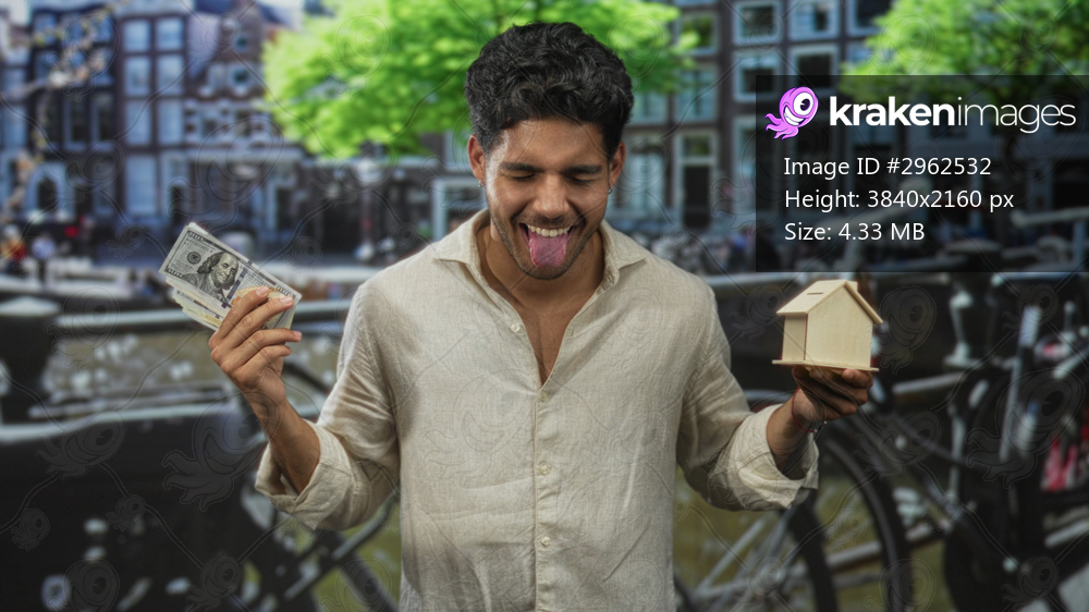Man holding us cash in one hand and a small wooden house in the other, tongue out and squinting, posed on a street by a canal with bicycles; playful wealth aspiration. - Kraken Images