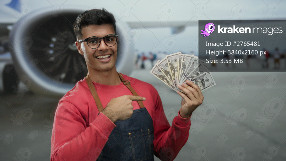 Man holding us dollars at airport terminal with airplane in background showing concept of travel and wealth outdoors in casual attire smiling and pointing at money. - Kraken Images