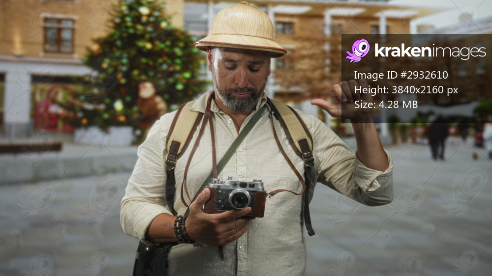 Man holding vintage camera and backpack pointing thumb on city street with hat and bracelets; wanderlust discovery.