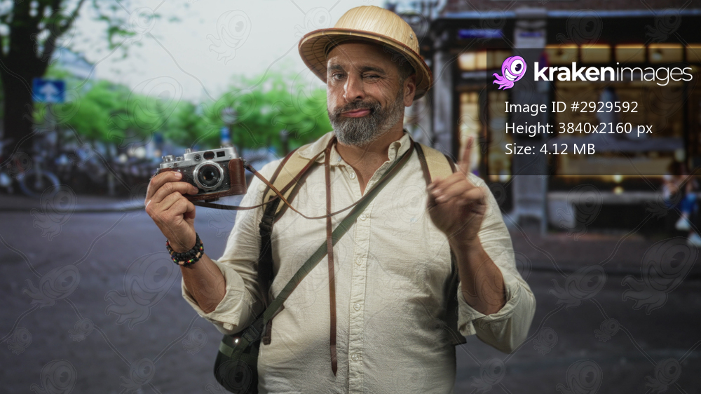 Man holding vintage camera and pointing index finger on a bustling city street with backpack and straw hat; playful curiosity.