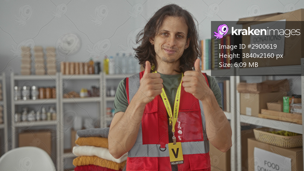 Man holding volunteer badge and yellow lanyard with hands in community center building among boxes and shelves; compassion service.