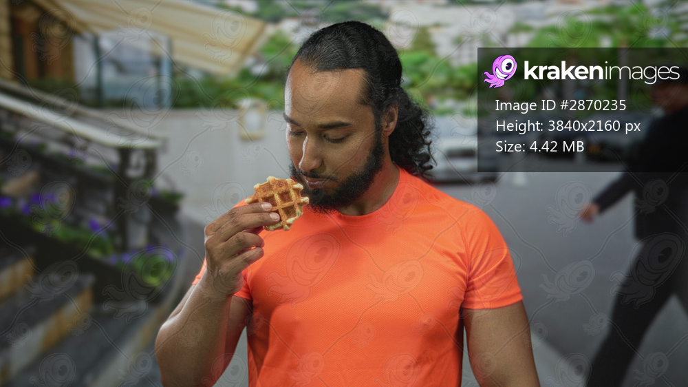 Man holding waffle to nose on street near parked cars and steps, wearing bright orange shirt; satisfaction snack moment.
